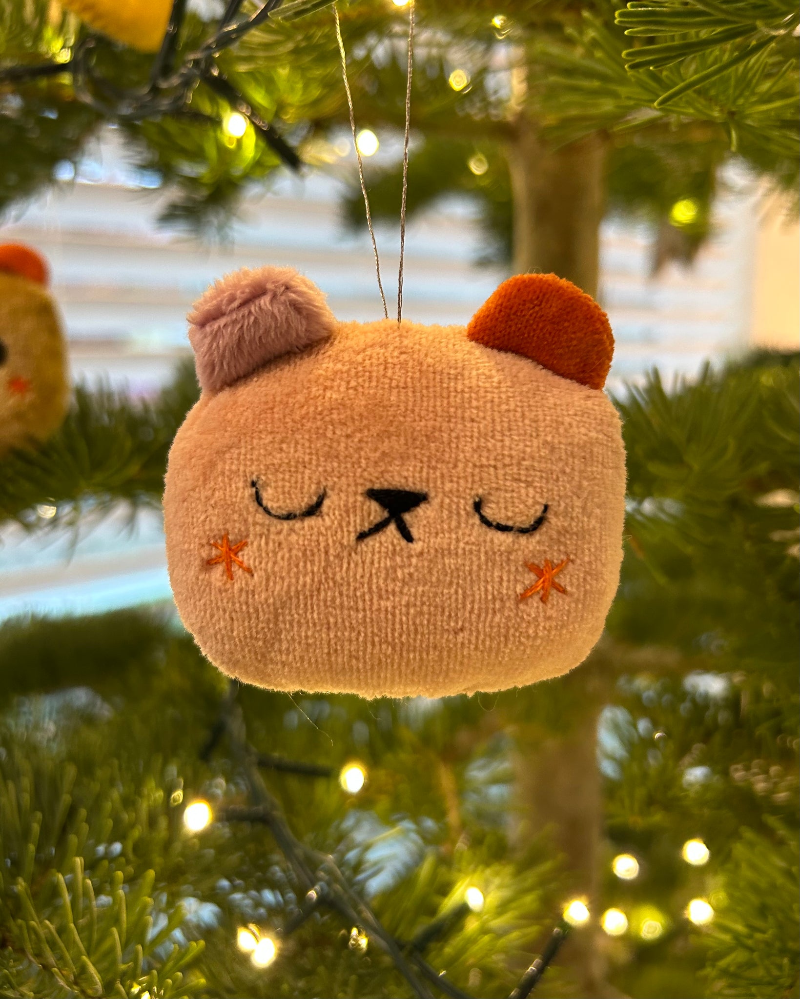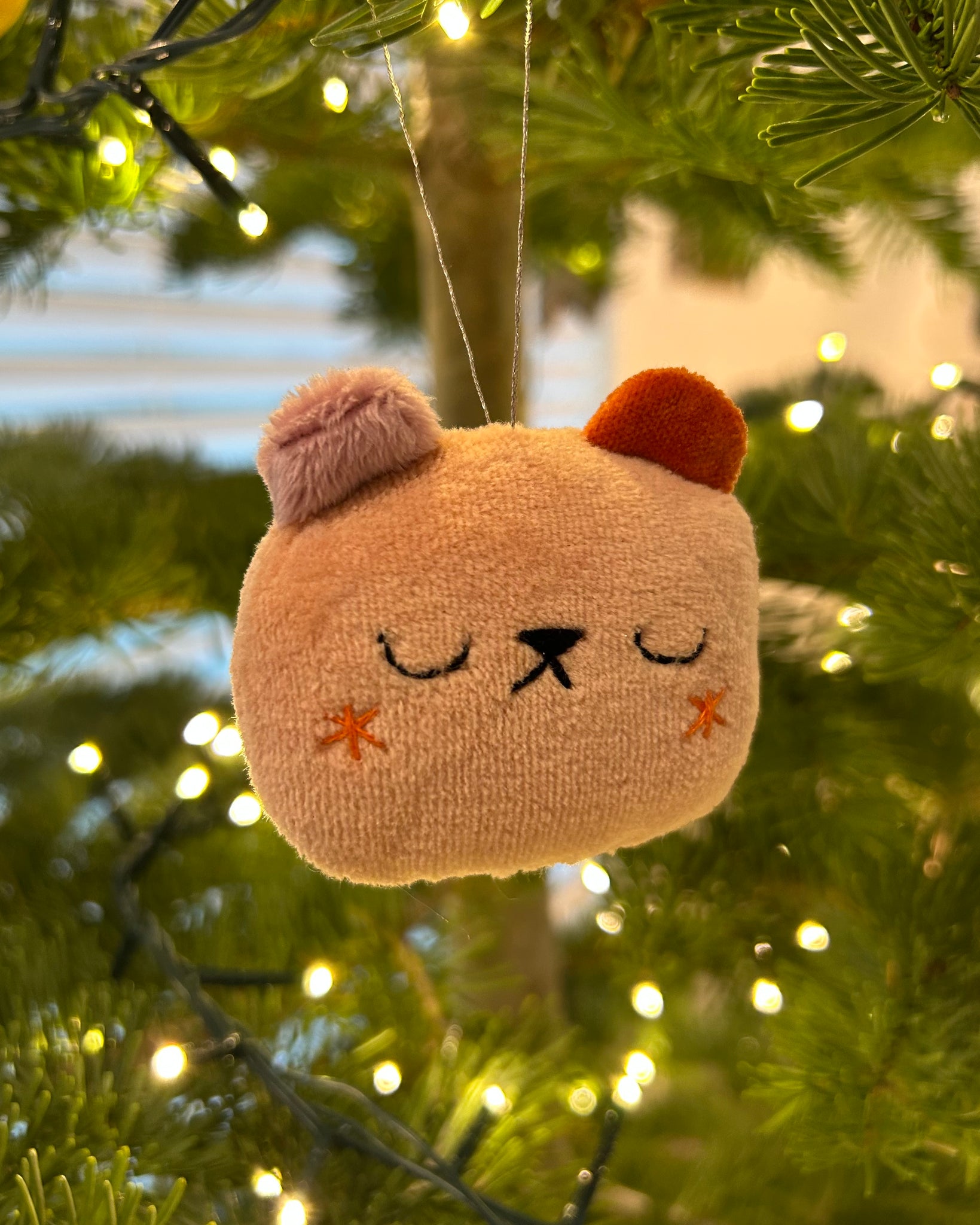 This ornament is made of hand dyed velour fabric, velveteen and minky ears, hand embroidered details and stuffed with poly fil.
