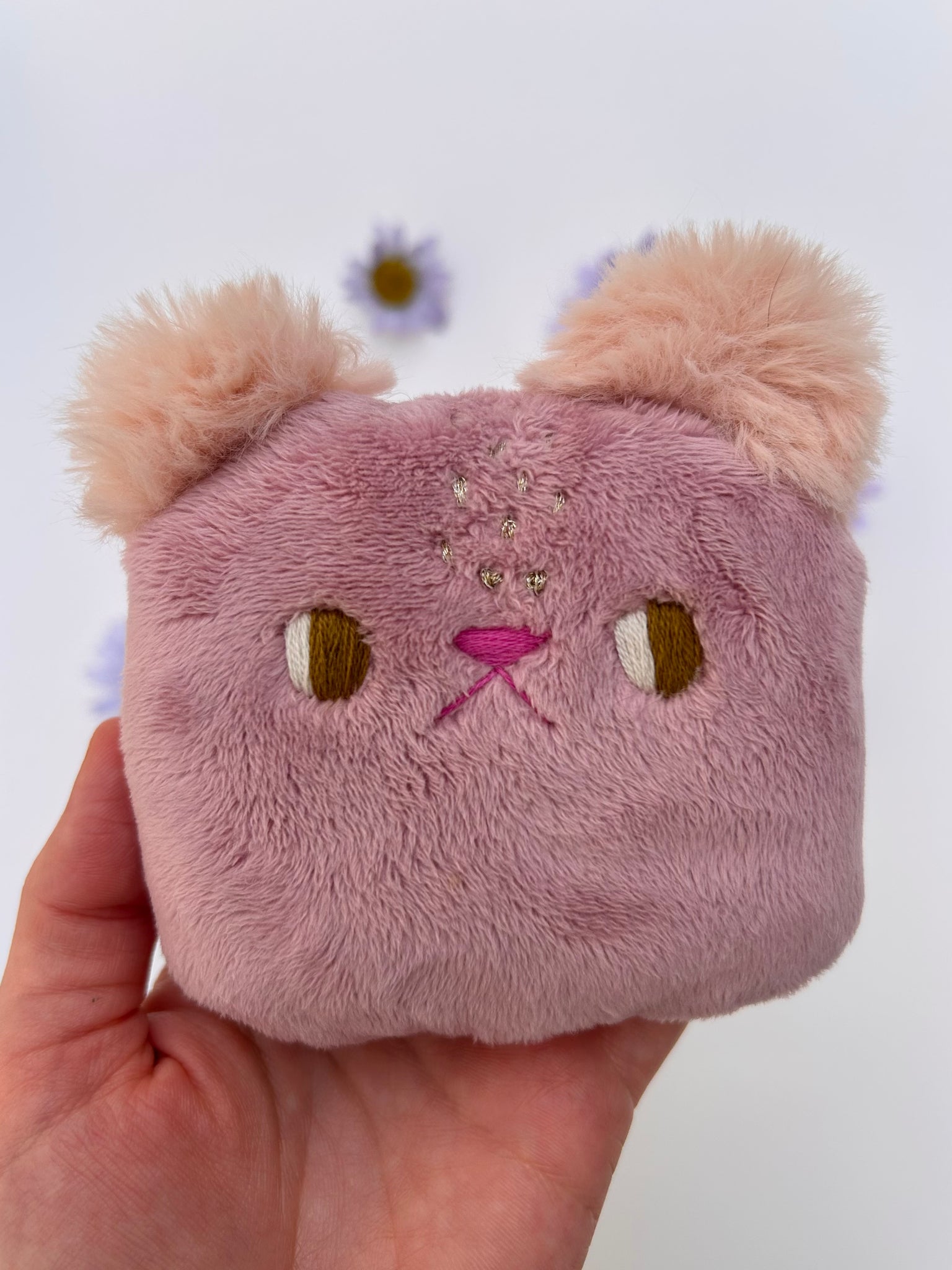A cute mini bear pillow made of minky fabric, hand embroidered details, faux fur ears and stuffed with polyfil.
