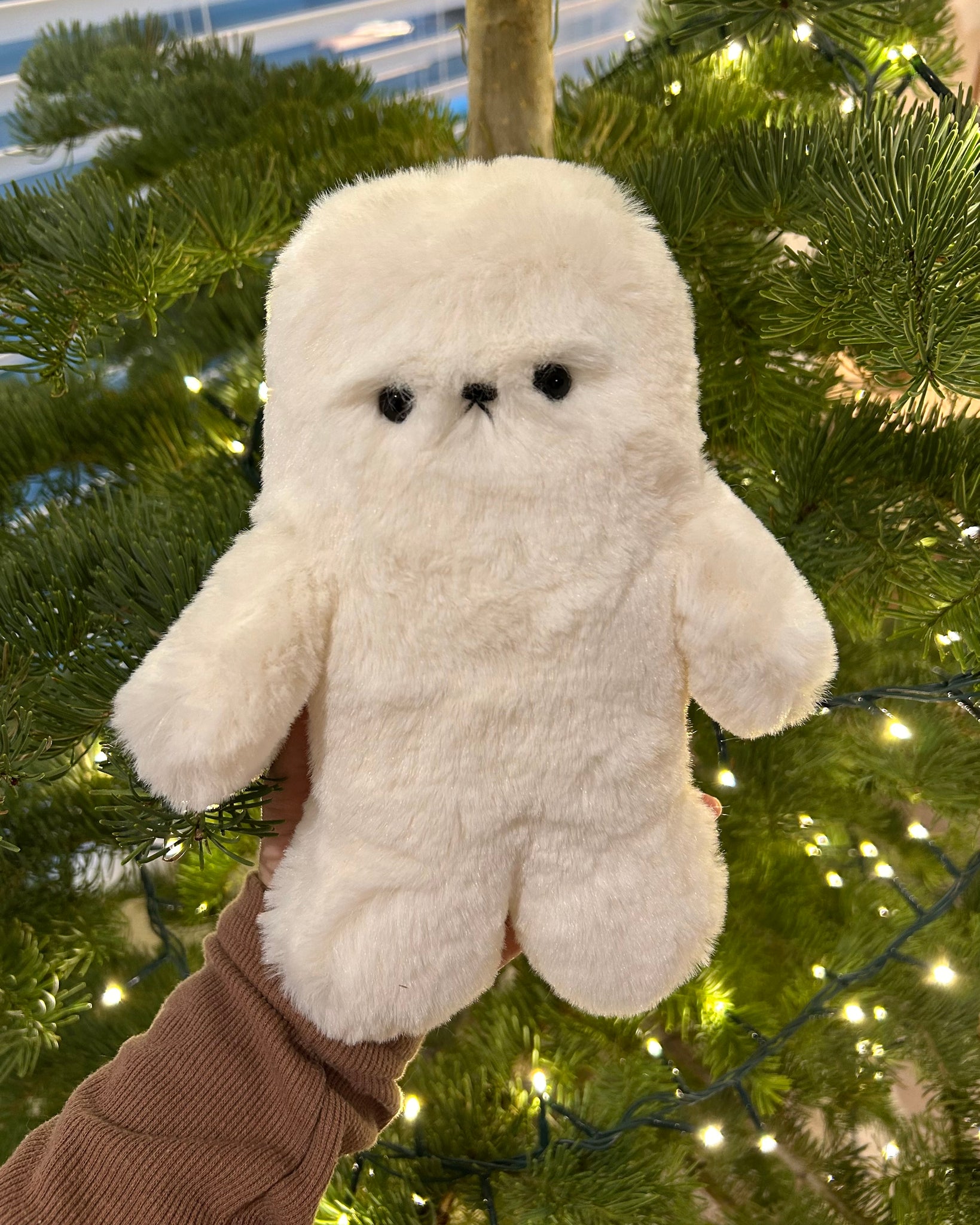 Mallow is made of minky fur, hand embroidered details, poly fil stuffing and some poly beads for weight. Comes with removable gold neck bow.