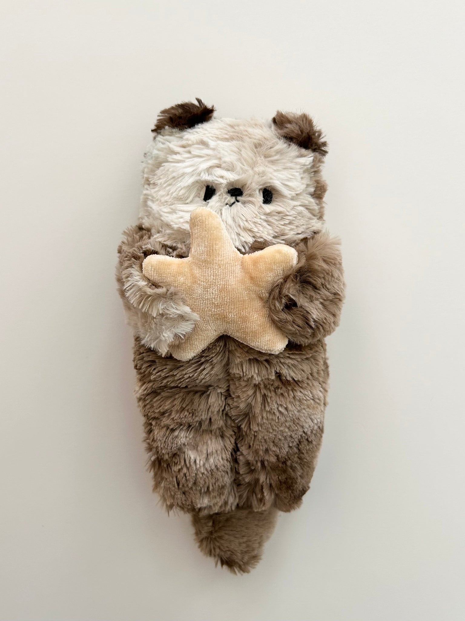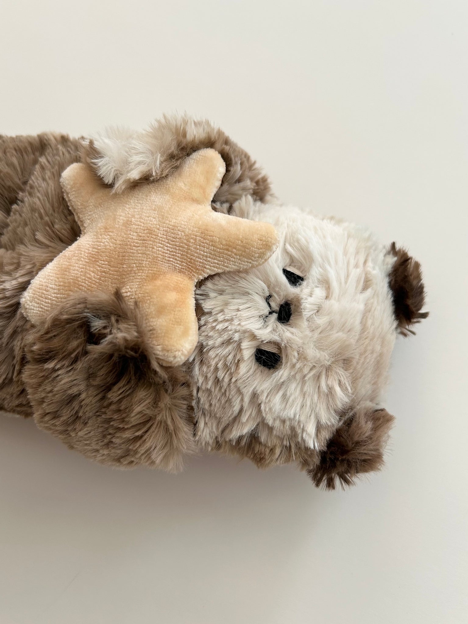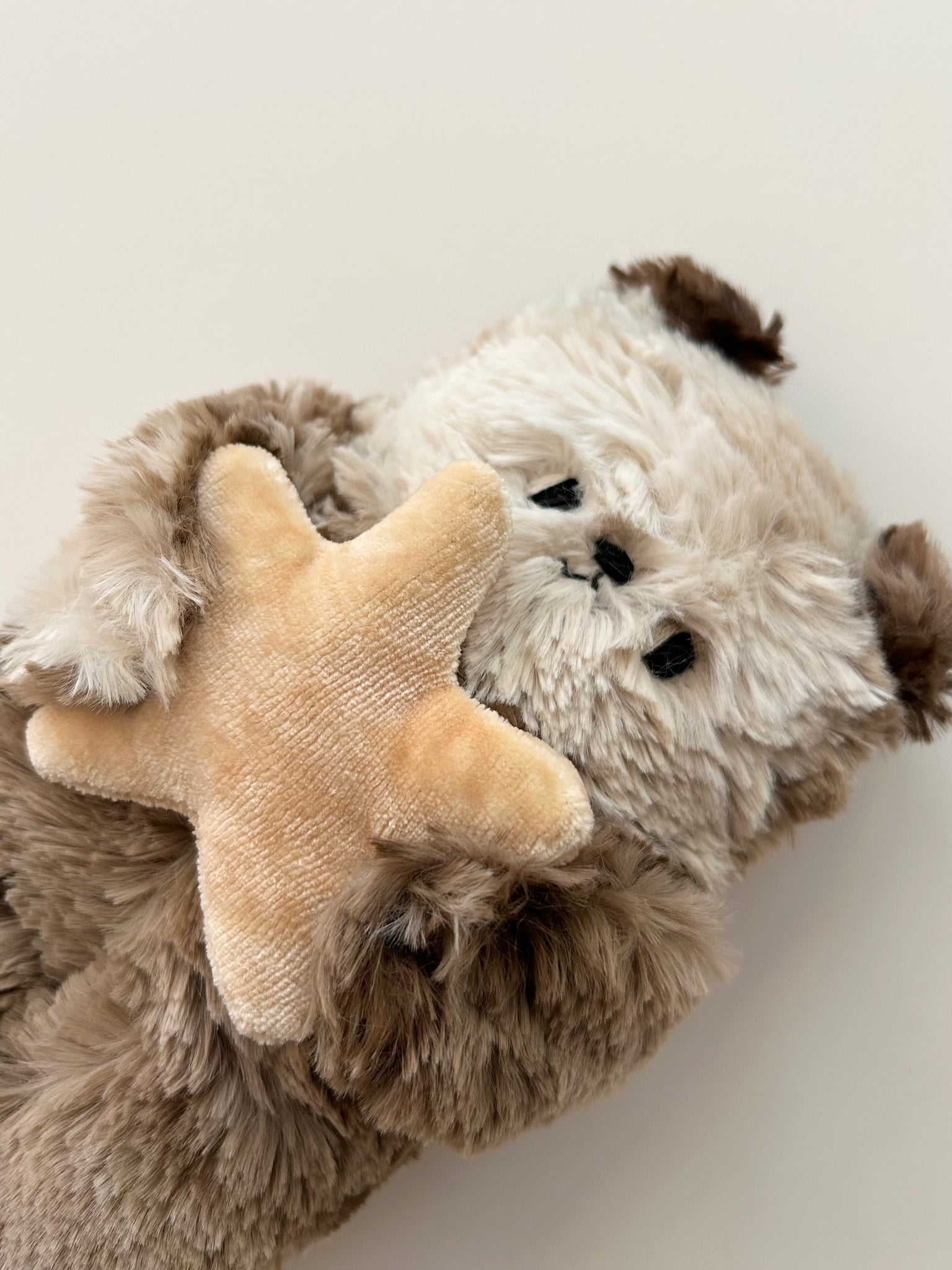 This little sea otter is made of faux fur, hand embroidered details with a velour star fish.Measures