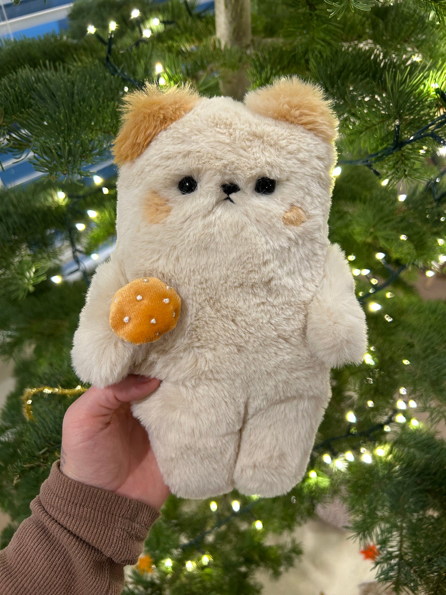 Toadstool the blushing bear is made of the softest minky fur fabric. Comes with a mushroom made of hand dyed velour fabric, sherpa and hand embroidered details. Stuffed with poly fill. Measures approx 11-12 inches tall.